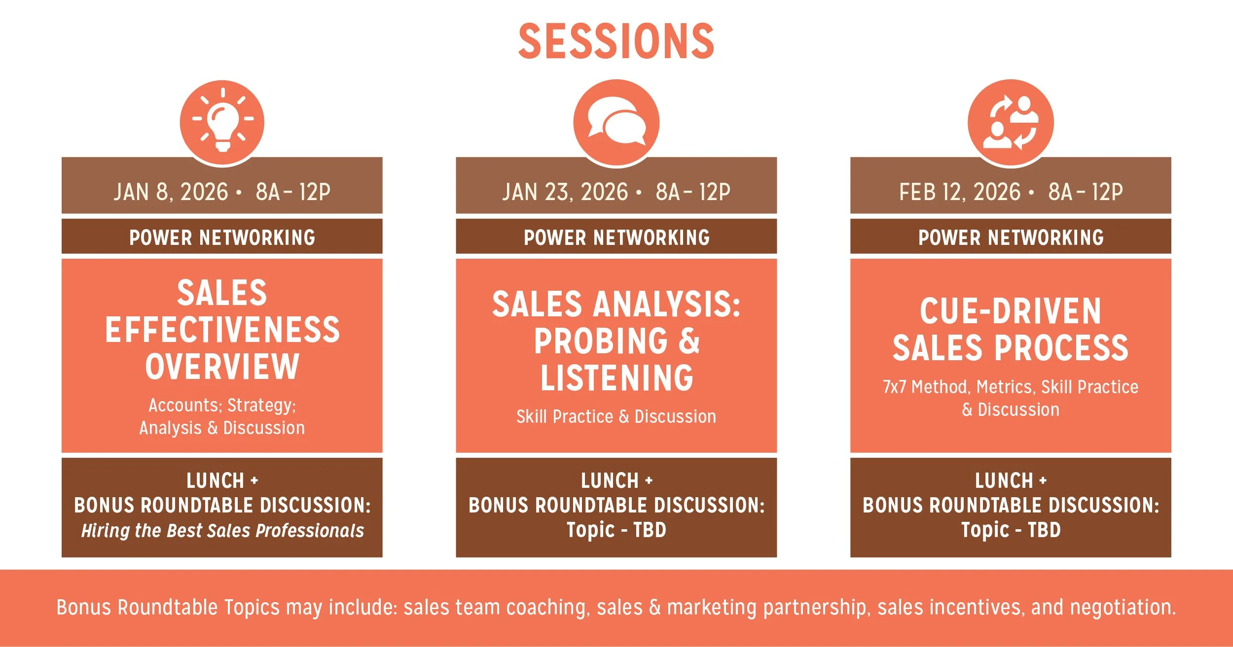 Built for sales representatives, account managers, business leaders and owners, learn how to improve your sales skills and performance through our exclusive three-day roundtable.